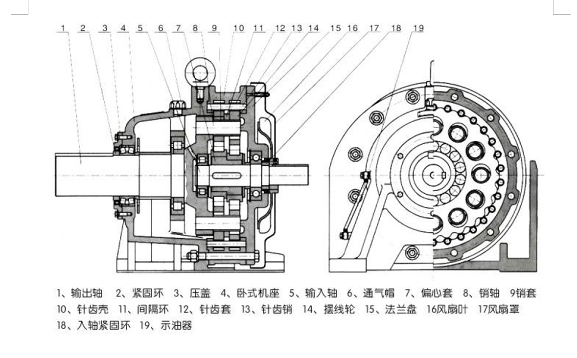一級BLD立式擺線針輪減速機全部傳動裝置結(jié)構(gòu)可分為三部分:輸入部分、減速部分、輸出部分,其輸入結(jié)構(gòu)是高速部分,連接輸入電動機(馬達);其輸出部分是減速機的低速部分,其輸出軸通過鏈輪或者聯(lián)軸器、連接盤等接入用戶需要帶動的設備。